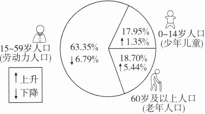 10.D [解析]从图中可以看出,目前我国劳动力人口虽然呈下降趋势,但是仍占全国总人口的63.35%,比重较大,劳动力不算短缺,①错误;我国60岁及以上人口占全国总人口的18.70%,人口老龄化现象凸显,因此我国应完善养老服务体系及设施,②③正确;从图中可以看出,我国老年人口比重偏大,且上升趋势显著,故我国人口年龄构成不合理,④错误。故选D。