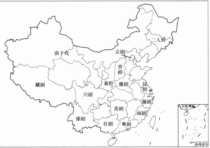 [传统文化](青岛模拟)中国戏曲种类繁多,百花齐放。读中国部分地方戏曲分布图,回答8~9题。