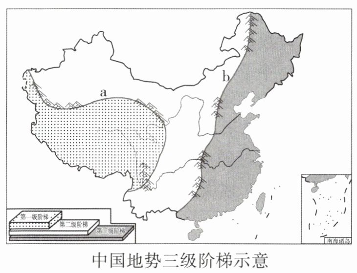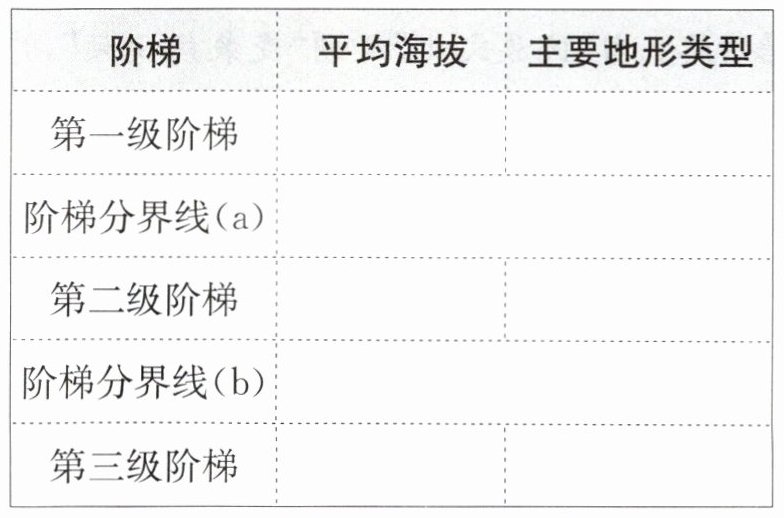 @@|阶梯|平均海拔|主要地形类型||第一级阶梯|4000米以上|高原||阶梯分界线(a)|昆仑山脉—阿尔金山脉—祁连山脉—横断山脉||第二级阶梯|1000~2000米|高原、盆地||阶梯分界线(b)|大兴安岭—太行山脉—巫山—雪峰山||第三级阶梯|500米以下|平原、丘陵|