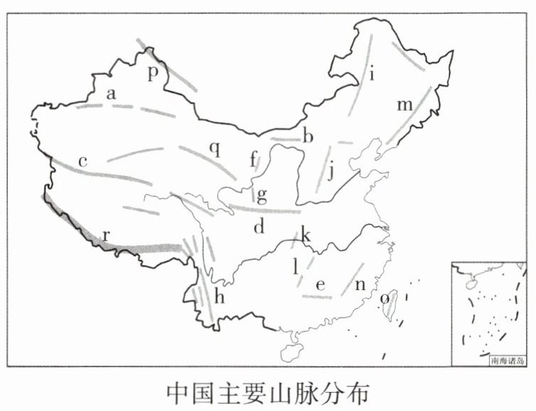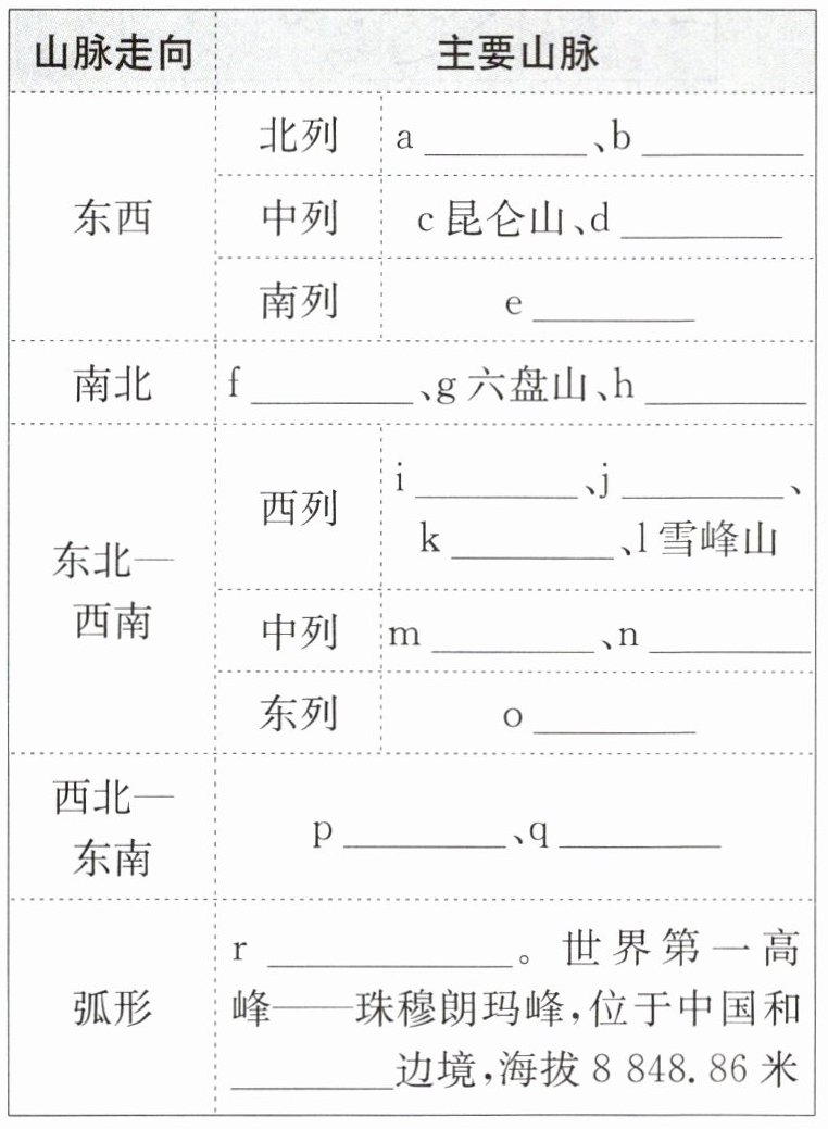 天山 阴山 秦岭 南岭 贺兰山 横断山脉 大兴安岭 太行山脉 巫山 长白山 武夷山 台湾山脉 阿尔泰山脉 祁连山脉 喜马拉雅山脉 尼泊尔