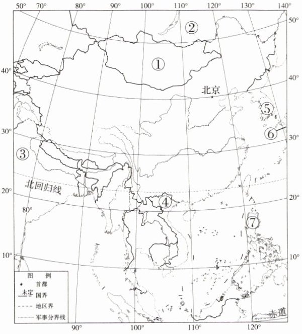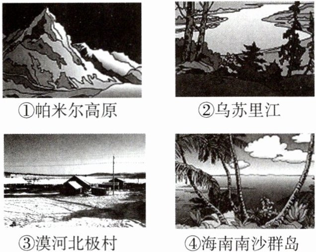4.A 5.C [解析]①②景观分别位于我国的最西端和最东端附近,其差异反映我国跨经度广、东西距离长,A、B两项错误;③④景观分别位于我国的最北端附近和最南端附近,其差异反映我国跨纬度广、跨温度带广,C项正确,D项错误。