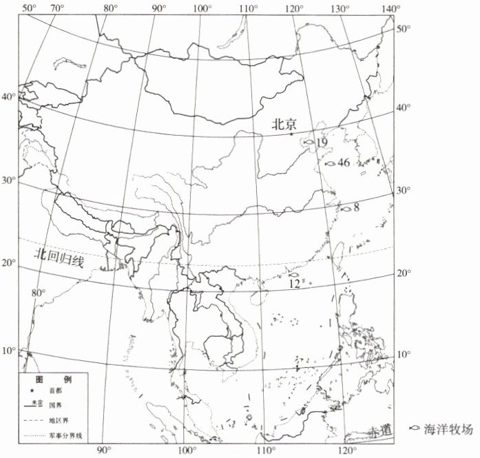 [新情境]海洋牧场是将人工培育的海洋生物聚集在一定海域内,进行有计划放养的新兴生产方式。读中国国家级海洋牧场示范区分布图,回答 7~8 题。