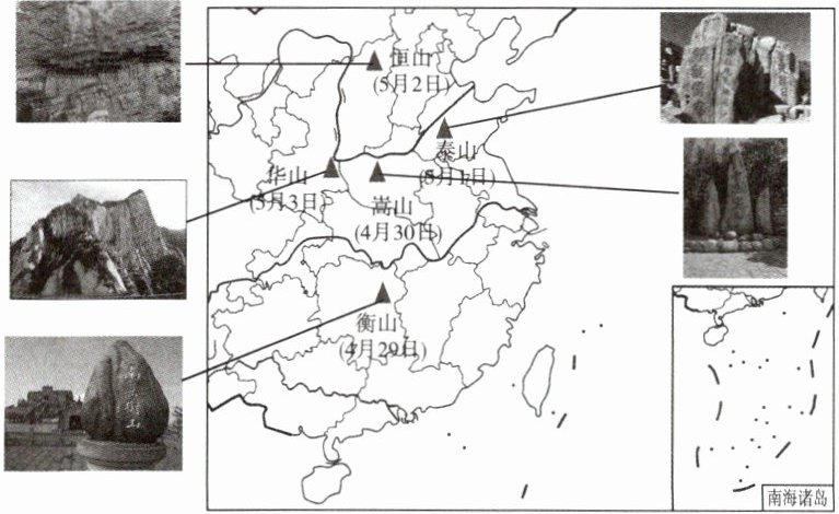 某年“五一”假期,某“90 后”小伙的旅行打卡震撼了无数人。他朝登山、夜赶车,一天登一峰,5 天登遍了中华五岳。读五岳分布示意图,回答 1~2 题。