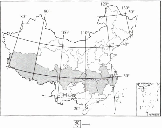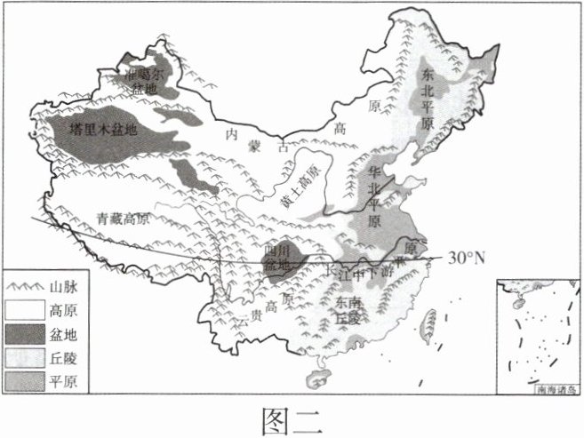 [新情境]某摄制组从浙江舟山群岛出发,沿北纬 30°线,自东向西进行采访,最后抵达西藏阿里地区。节目着重展现北纬 30°沿线的自然风光、历史文化、民俗风情和普通百姓的生活状态。读摄制组主要拍摄的省级行政区图(图一)和中国的地形图(图二),回答 5~7 题。