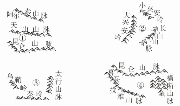 (青岛期中)纵横交织的山脉,构成了我国地形的骨架,高原、平原、盆地、丘陵镶嵌其中。读图,回答 3~4 题。