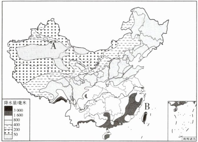 (1)空间分布特点:从东南沿海向西北内陆逐渐减少。中国降水最多的地方是台湾省的B火烧寮,降水最少的地方是新疆的A托克逊。