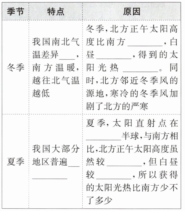 |冬季|我国南北气温差异大,南方温暖,越往北气温越低|冬季,北方正午太阳高度比南方低,白昼短,得到的太阳光热少。同时,北方邻近冬季风的源地,寒冷的冬季风加剧了北方的严寒|