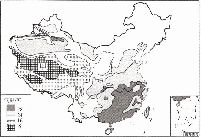 读中国7月平均气温分布图,回答3~4题。
