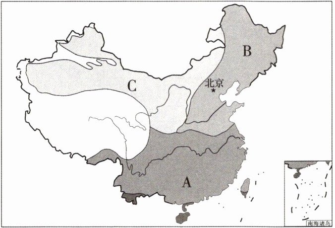 (2)气候分布:我国东部有世界典型的季风气候,自南向北依次为热带季风气候、A亚热带季风气候、B温带季风气候。西北部大多为C温带大陆性气候。青藏高原为独特的高原山地气候。西部高原山地表现出明显的垂直气候特征。