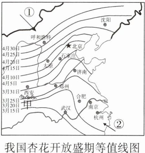 (3)“桃树、杏树、梨树,你不让我,我不让你,都开满了花赶趟儿。”阅读“我国杏花开放盛期等值线图”,图中杏花开放最早的城市是