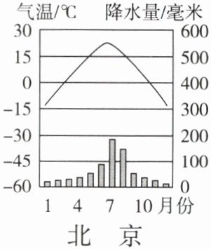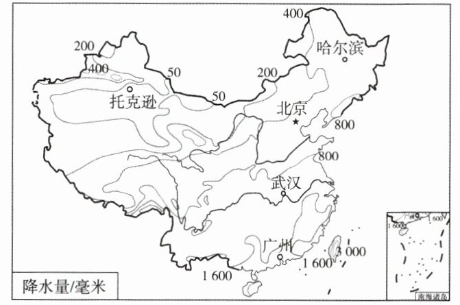毫米年等降水量线大致吻合。(5)我国的首都——北京位于