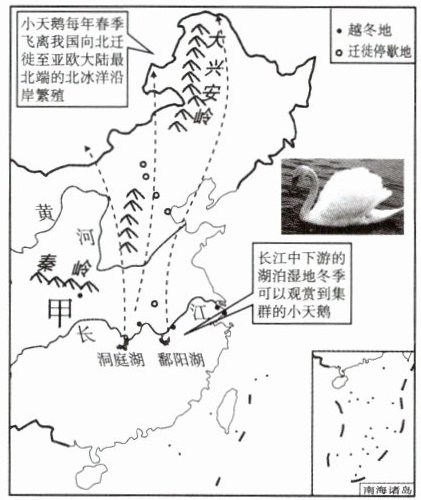 D [解析]秦岭山脉呈东西走向。甲位于秦岭附近略偏南地区,该地是小天鹅在我国越冬地的最北处,这里适合越冬的优势条件是地处亚热带季风气候区,属于亚热带和湿润地区,冬季风被秦岭等山脉阻挡,气候比较温暖,该地年降水量在800毫米以上,A、B、C三项错误,D项正确。