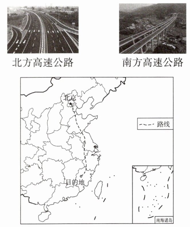 (3)出发地北京位于华北平原,目的地的地形以丘陵为主。南方地区河网稠密,高速公路多桥梁和隧道。