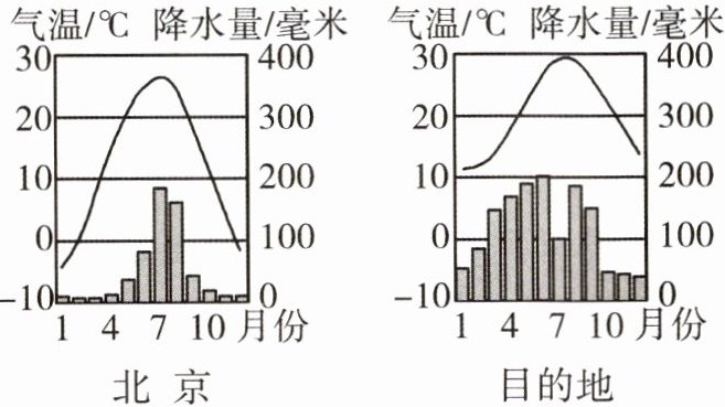 (1)冬季我国南北气温差异大,北京位于北方地区,春节期间气温低,小明需要穿戴好羽绒服、围巾、帽子;读目的地的气候资料图可知,此时当地气温约为11℃;中国南北跨纬度大,造成两地的温差较大。