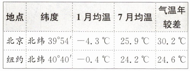 5. 玲玲搜集了北京和纽约的气温资料。下表数据说明我国气候具有的特征是(
