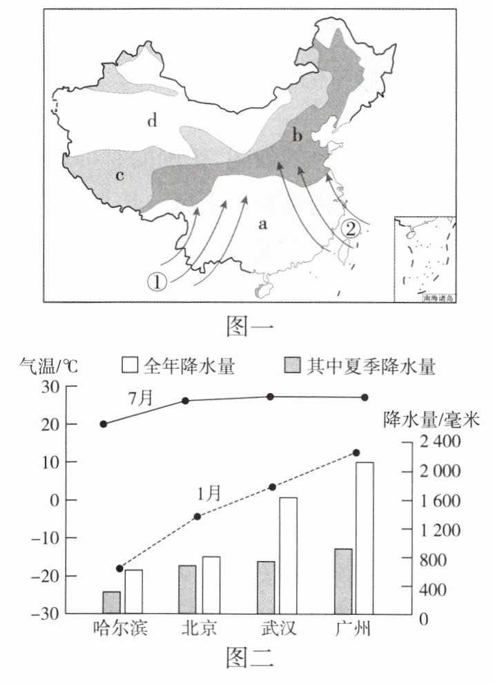 6.B [解析]根据图中风向判断,西南季风①来自印度洋,东南季风②来自太平洋,反映的季节是夏季,A、C两项正确,均不符合题意;干湿地区d为干旱地区,由于其深居内陆,距离海洋较远,受夏季风影响较弱,降水稀少,地表荒漠广布,主要植被为荒漠草原,B项错误,符合题意;受夏季风的影响,我国年降水量从东南沿海向西北内陆递减,D项正确,不符合题意。故选B。 7.B [解析]四城市中,夏季降水量占全年降水量比例最大的城市是北京,北京属于温带季风气候。故选B。