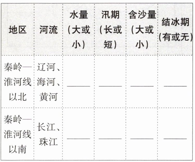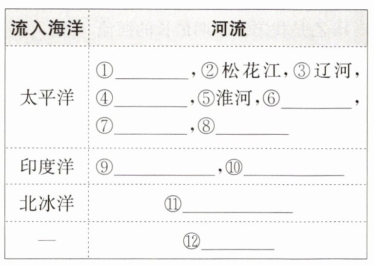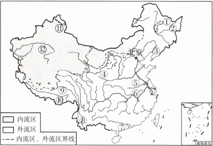 %。我国绝大多数河流分布在外流区,外流河年径流总量占全国的95%以上,内流河年径流总量不足5%。- (3)填写出我国主要的河流