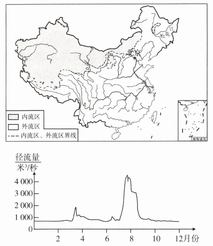 读中国主要河流分布图及松花江的径流量年变化曲线图,回答1~2题。