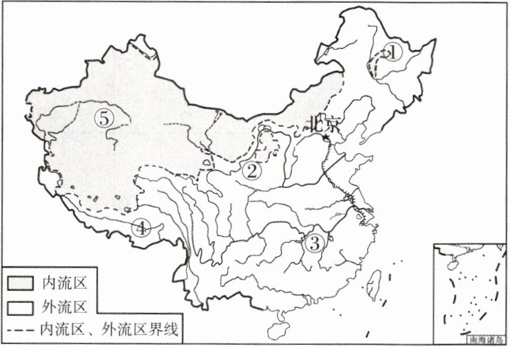 (2)图中①~⑤五条河流中,位于我国内流区的是