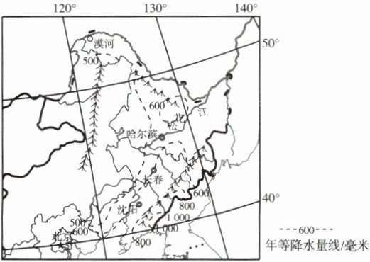 8.B [解析]4月份松花江的流量较大,主要是由于春季气温回升,积雪融化后进入河流,河流水量增加;4月份时降水量很少,与土壤解冻和冰川融化关系小。故选B。 9.A
