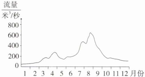 (青岛期中)松花江发源于长白山天池(白头山天池),主要流经东北平原的湿润和半湿润地区,是黑龙江在中国境内最大支流。读东北地区简图、松花江某水文站多年平均径流量图,回答8~9题。