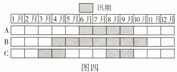 自然环境各要素对河流的水文特征影响很大,我国各地河流的水文特征深深地打上了自然环境的烙印。如图四中A、B、C是打乱了顺序的松花江、长江、珠江的汛期状况。
