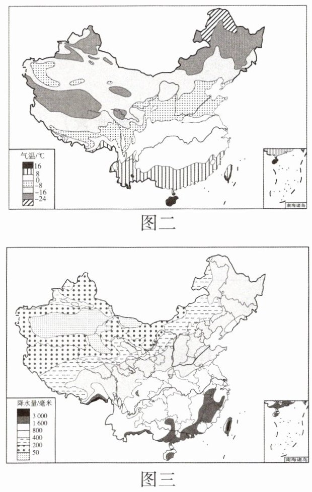 探究资料:中国地势三级阶梯示意图(图一)、中国1月平均气温分布图(图二)、中国年降水量分布图(图三)。