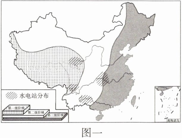 (1)我国地势西高东低,所以我国许多大河自西向东流入太平洋。河流在从高一级阶梯流入低一级阶梯的河段时,因落差巨大而产生丰富的水能。