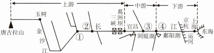 [跨学科](聊城期中)“予观夫巴陵胜状,在洞庭一湖。衔远山,吞长江,浩浩汤汤,横无际涯……”节选自范仲淹的《岳阳楼记》。读长江流域示意图,回答 8~9 题。