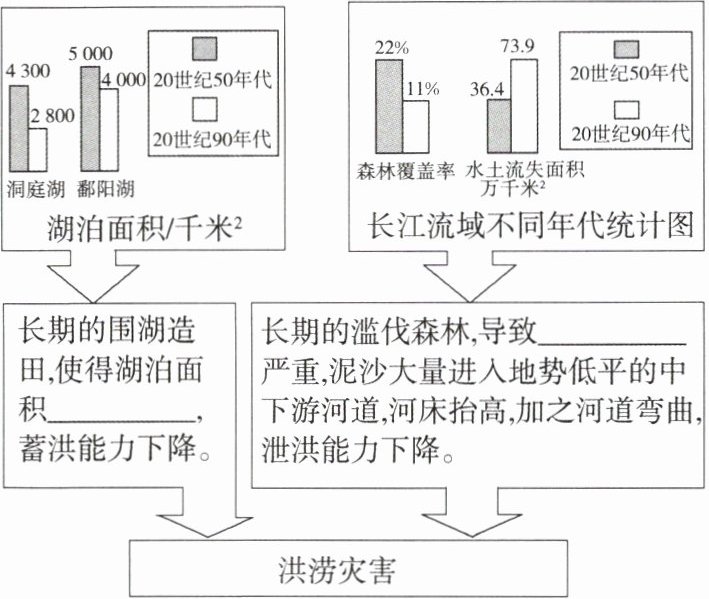 归纳总结:长江洪涝灾害多发,是流域内地形、气候等自然因素和滥伐森林、围湖造田等人为因素综合作用的结果。