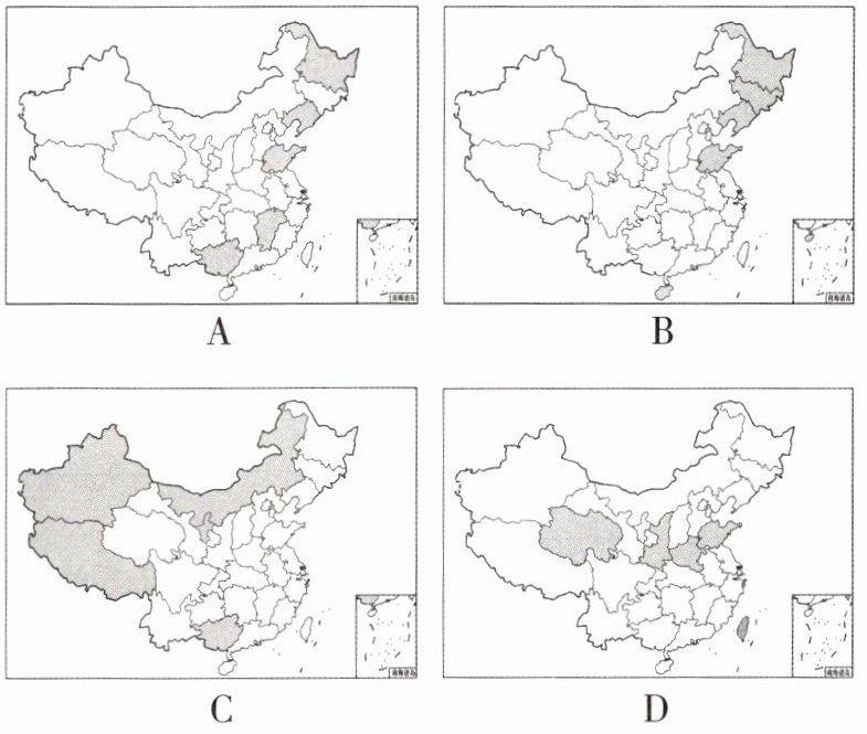 5. 我国有新疆、西藏、内蒙古、宁夏和广西 5 个自治区,若阴影区域代表这些自治区的分布,则正确的分布图是(