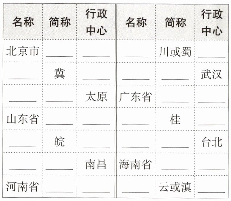 三、中国部分省级行政区的名称、简称和行政中心(★★☆)