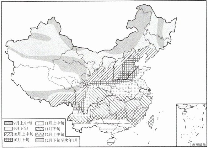 [跨学科]“远上寒山石径斜,白云生处有人家。停车坐爱枫林晚,霜叶红于二月花。”这首诗展现出一幅动人的山林秋色图,自古以来文人墨客都喜欢用红叶表达对秋色的赞美。下图示意中国红叶最佳观赏期的时空分布。据此回答 9~10 题。