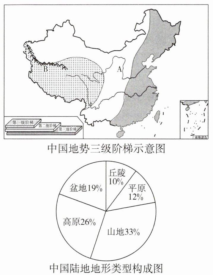 海。(2)“中国地势三级阶梯示意图”中 B 为