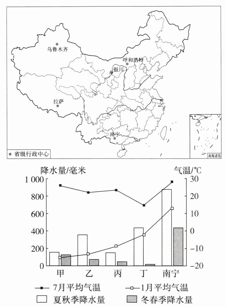 (青岛模拟)读五个省级行政中心分布示意图和五个城市气候资料统计图,回答 7~8 题。