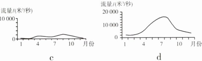 3.C [解析]据图并结合所学知识可知,丙为山东省,河流③为黄河,位于北方地区,冬季最冷月均温在$0^{\circ }C$以下,河流有结冰现象,C项正确;甲为云南省,河流①为长江,是我国水量最大的河流,A项错误;乙为广东省,河流②为珠江,是我国汛期最长的河流,B项错误;丁为黑龙江省,河流④为松花江,冬季有结冰现象,D项错误。故选C。4.A [解析]读图可知,①为长江,流量最大,汛期较长,与a相符,A项正确;②为珠江,汛期最长,流量较大,与d对应,B项错误;③为黄河,汛期较长江、珠江短,与b对应,C项错误;④为松花江,流量小,有春汛、夏汛两个汛期,与c相符,D项错误。故选A。