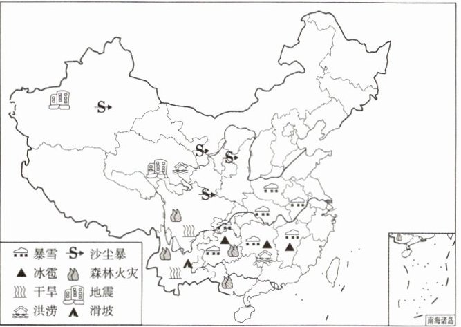 (滨州模拟)2024 年第一季度我国自然灾害情况如下:以低温雨雪冰冻、地震和地质灾害为主,干旱、风雹、洪涝、沙尘暴、森林火灾等不同程度发生,造成一千多万人不同程度受灾。读图,回答 11~12 题。
