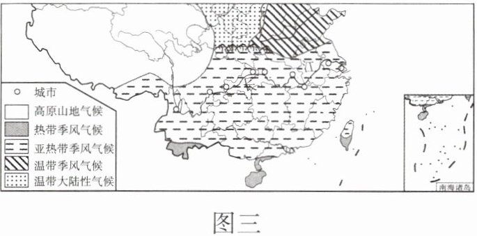 16. 某中学地理实验探究课堂,以“河流开发与治理”为主题开展学习活动。图一为水能影响因素实验示意图;图二为湖泊对河流径流的调蓄作用示意图;图三为我国局部气候类型分布图。读图文资料,完成研究报告。
