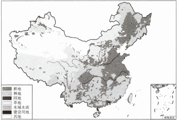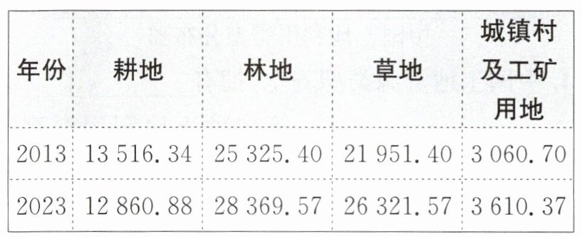 [原创题]中国土地资源类型齐全,拥有耕地、林地、草地等多种土地利用类型,这有利于因地制宜,对土地进行多样化的开发利用。下面是中国土地利用类型分布图及我国四类土地利用类型 2013 年、2023 年面积(单位:万公顷)变化表。据此回答 4~6 题。