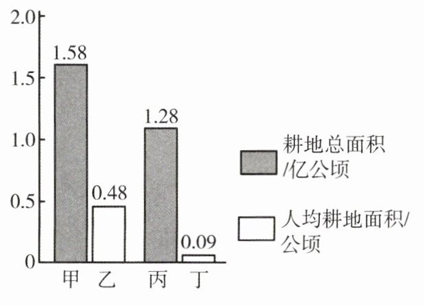 [教材变式题]中国陆地总面积与美国差不多,耕地总面积却少于美国,人均耕地面积更少于美国。读 2020 年中国、美国耕地总面积和人均耕地面积比较图,回答 2~3 题。