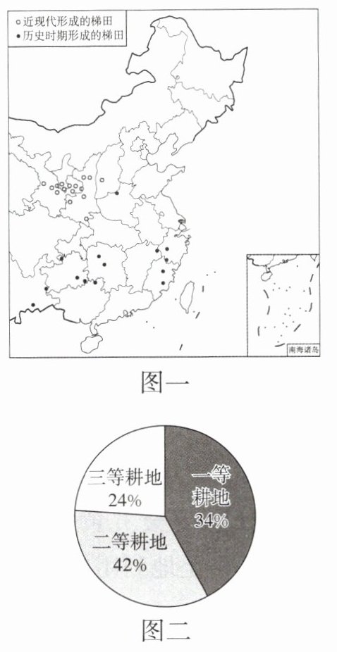7. 土地是人类的衣食之源、立国之本。图一为我国连片面积较大的梯田分布示意图,图二为中国耕地质量等级比例示意图。结合图文资料,回答下列问题。