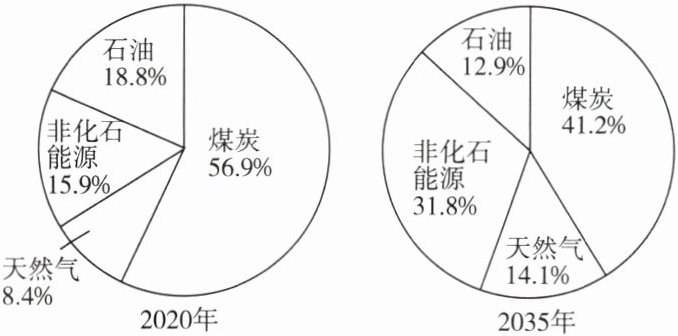 读我国 2020 年和 2035 年(预测)一次能源消费构成情况,回答 5~7 题。