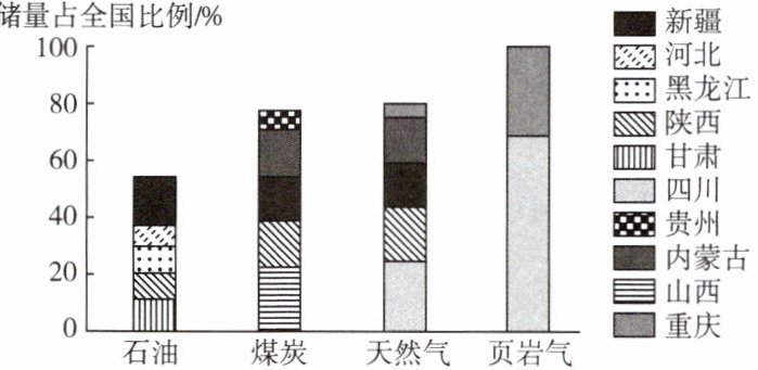 3.D [解析]中国的矿产资源空间分布不均匀,总体上北方地区分布较多,南方地区分布较少,A项错误;新疆的石油储量居全国首位,B项错误;陕西的煤炭储量小于天然气占全国的比例,C项错误;中国的页岩气主要分布在四川盆地,D项正确。 4.A