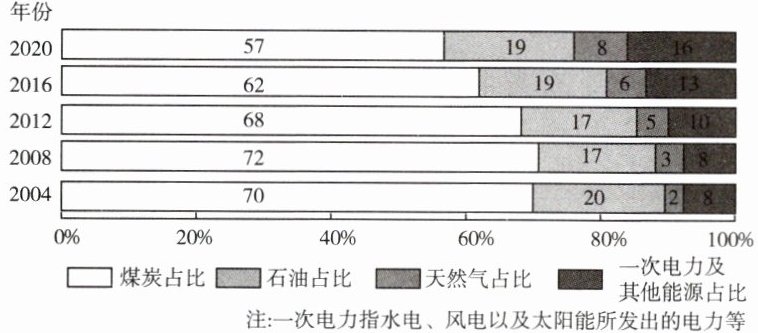 读我国 2004—2020 年能源消费占比构成图,回答 1~2 题。