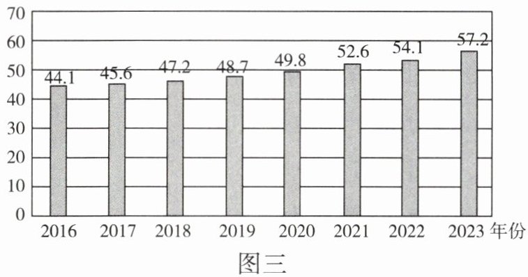材料二 近年来我国的能源生产量稳步增加,但每年仍存在比较大的缺口,主要靠进口的化石能源补充。图三为 2016—2023 年我国能源消费量柱状统计图。