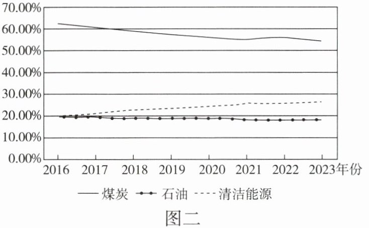(3)据图二,说明 2016—2023 年我国煤炭、石油、清洁能源消费比重的变化特点。