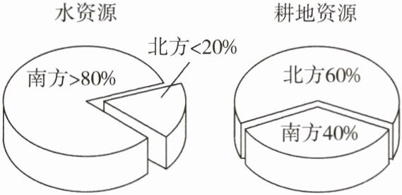 (2)读“南北方水土资源比例图”,分析我国耕地资源与水资源在南北方地区分布的差异: