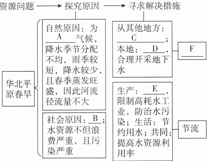 (3)我国华北地区春季缺水严重,有“春雨贵如油”的说法。请根据所学将下列思维导图补充完整。