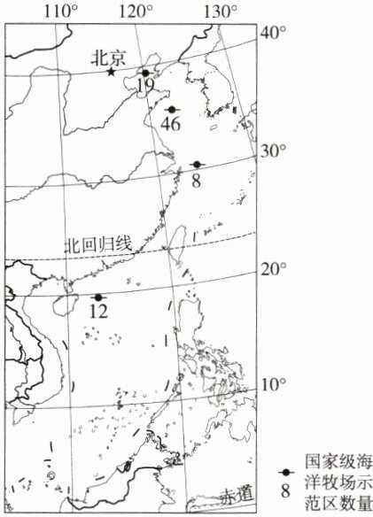 4. 海洋牧场是利用自然的海洋生态环境,对鱼、虾、贝、藻等资源进行有计划、有目的的海上放养。下面为我国四大海域国家级海洋牧场示范区数量示意图。海洋牧场是一种新型海洋资源开发利用模式,主要利用了海洋的(