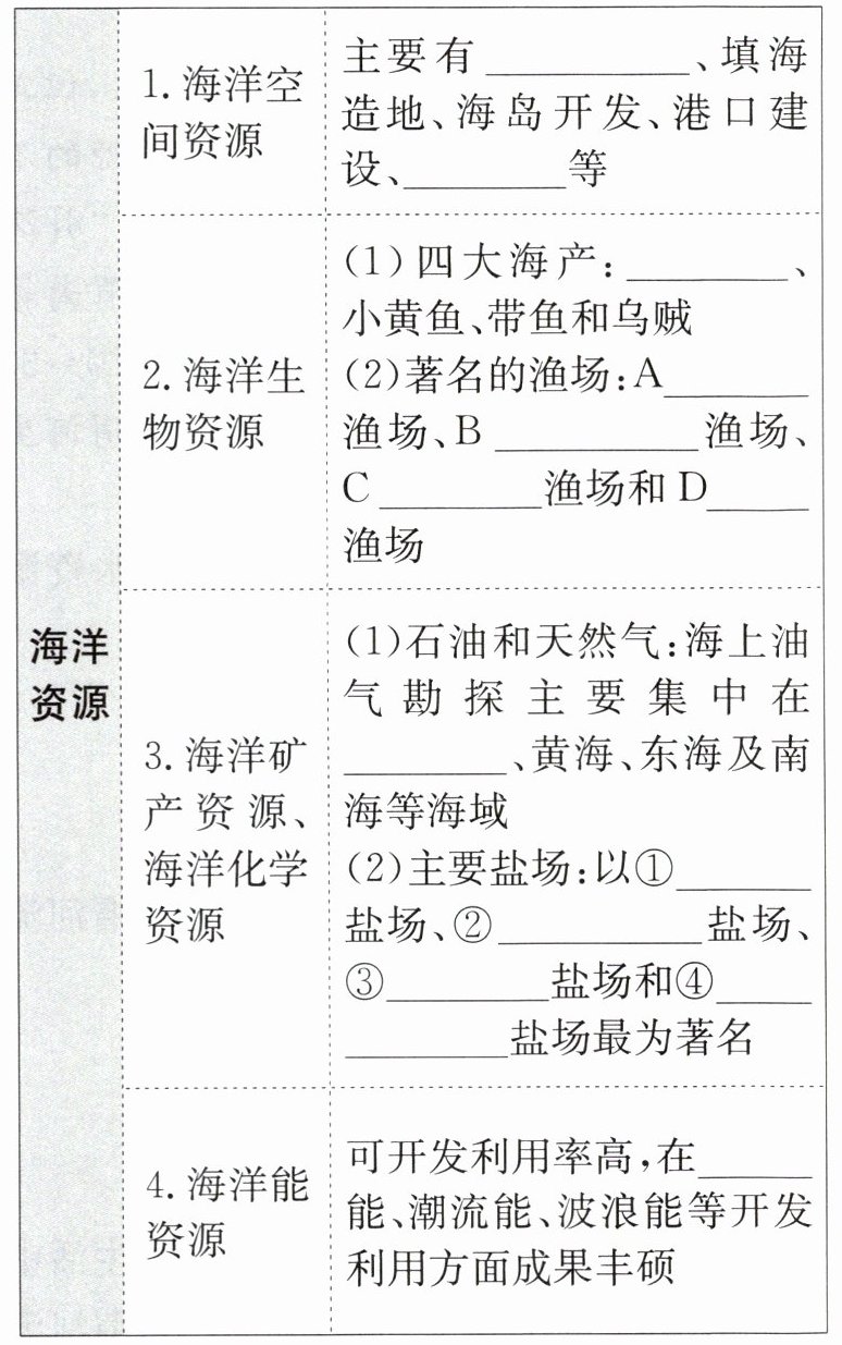 )①海洋矿产 ②耕海牧渔 ③潮汐能 ④港口建设 ⑤填海造地